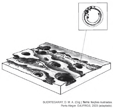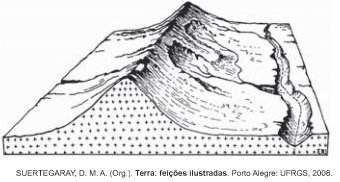 As características morfológicas do terreno estão representadas no bloco diagrama, que mostra uma região acometida por processos erosivos decorrentes da.